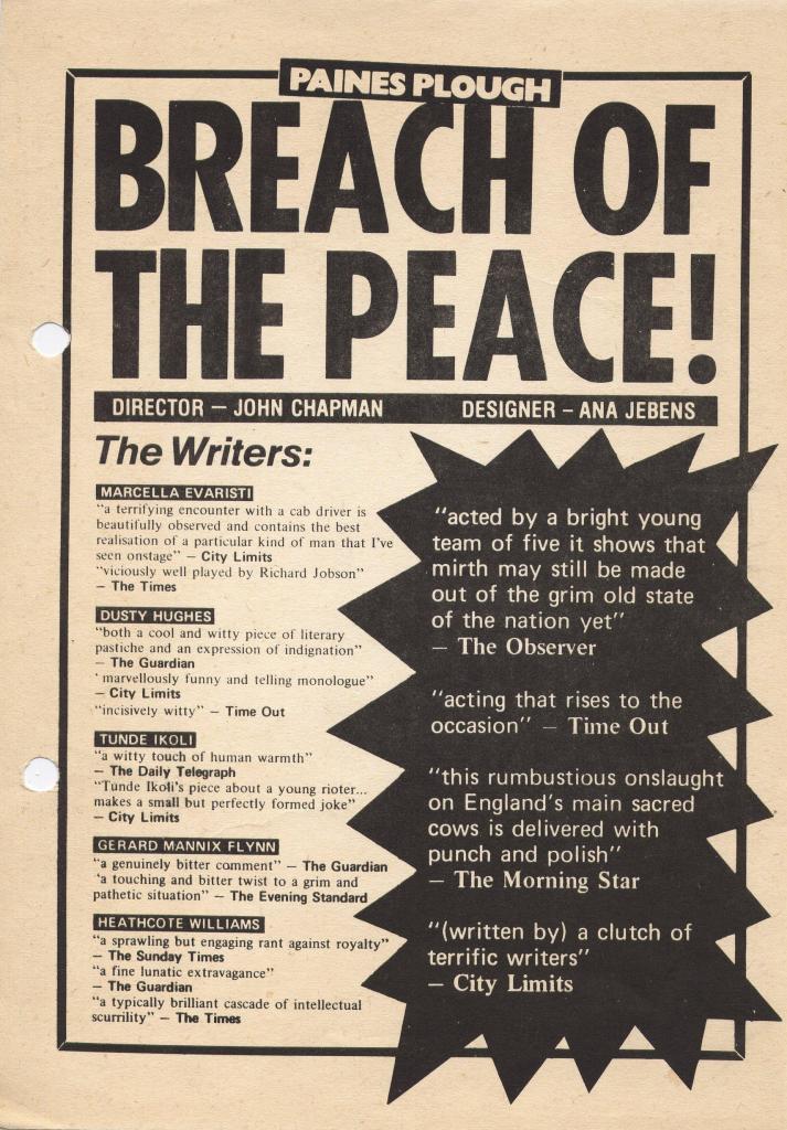 Breach of the Peace toured the UK with this collection of short pieces by established theatre writers responding to a time of unrest and disquiet. Acting company included Richard Jobson whose band, The Skids, were riding high at the time.