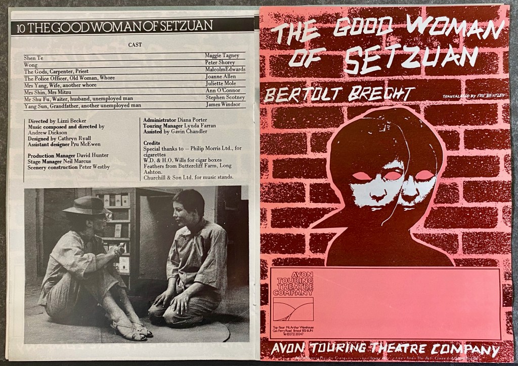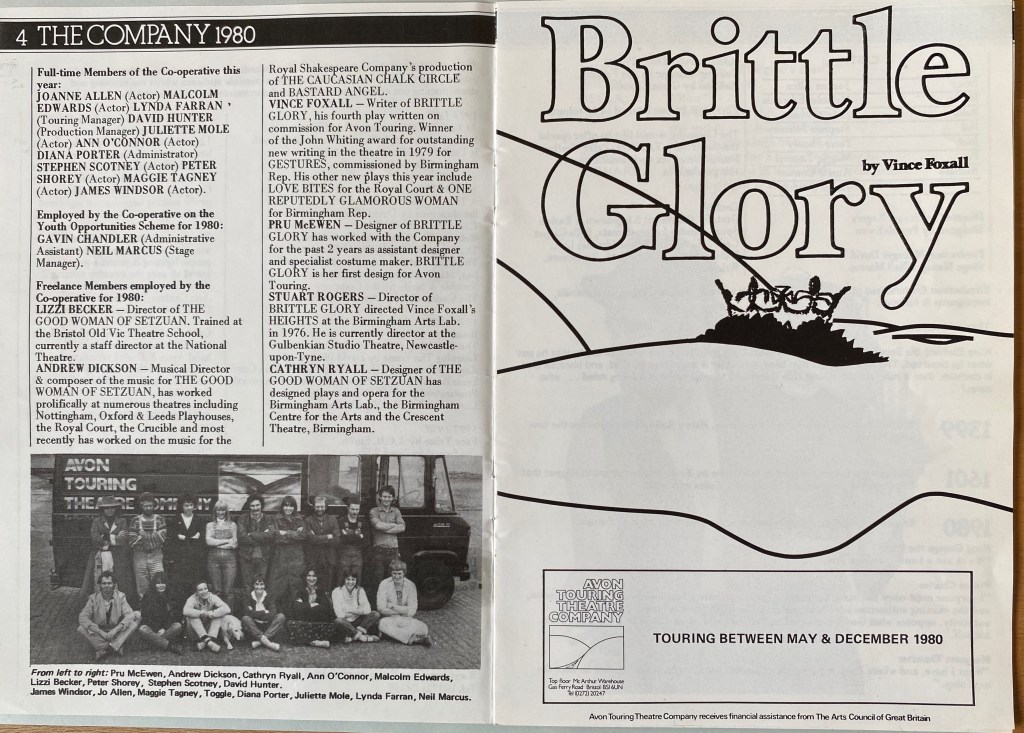 Avon Touring was a co-operative theatre company operating out of the top floor of MacArthur Warehouse on the Bristol Docks. On the van we carried sets for the adult show, BRITTLE GLORY by Vince Foxall and our schools’ show THE GOOD WOMAN OF SETZUAN by Bertolt Brecht.