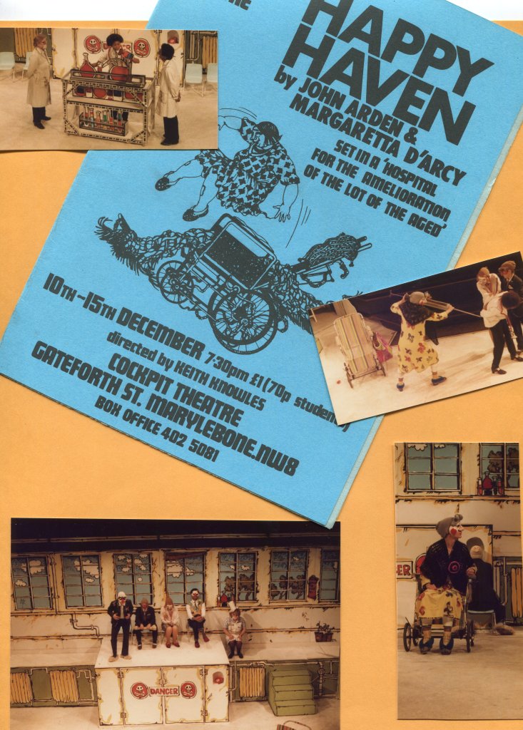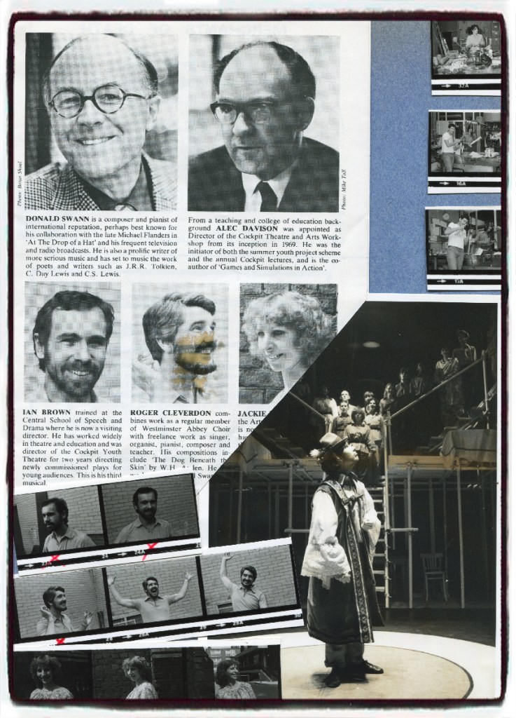 My first show at the Cockpit, THE YEAST FACTORY, by Alec Davidison involved raising both Donald Swann and his piano onto a scaffold platform way above the stage. Among the cast was a teenage Tim Roth. For the Mime Festival Ingenuity and speed were needed to accommodate the varying needs of many visiting international mime artists in the theatre. Youth Theatre Productions involved brightly painted, lightweight sets made from essentially thick cardboard.