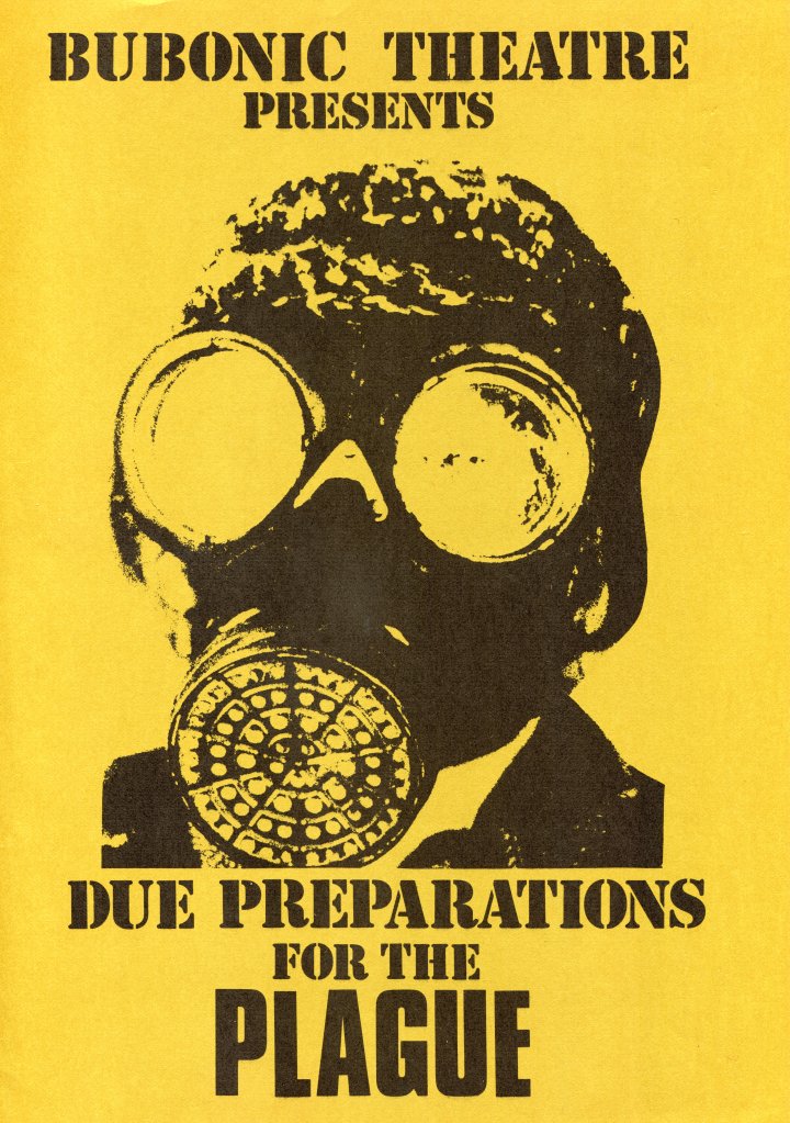 Due Preparations for the Plague was loosely based on the book by Daniel Defoe at a time when there was a real nuclear threat (“Protect and Survive” leaflets plopped through our letterboxes). First performed at York University in March 1977 we toured to Palermo, Lyons, L’Aquila, Poznan and Cracow as well as Arts Centre York.